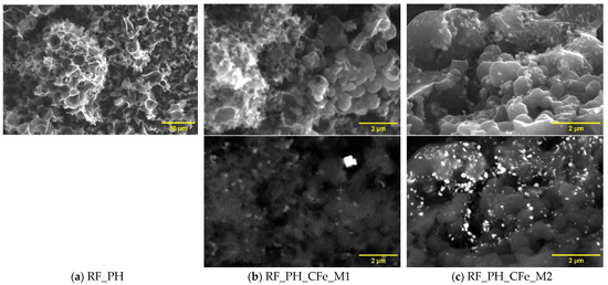 Activation with KOH leads to the formation of carbon material in the form of a sponge (Figure 5). This structure is visible in the reference material and after enrichment with iron as well. Some spherical structures can be found, but even they are porous. After enrichment with iron according to the M1 method, a sample containing iron concentration 2.27 ± 1.18% forms. The M2 method is allowed to introduce 10.92 ± 1.41% of iron (ca. five times greater than M1). Iron particles are embedded in carbon matrix, similar for sample RF_PO_CFe_M2.