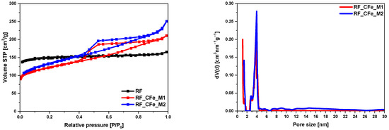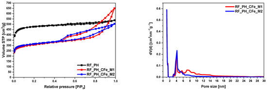 The sample activated with potassium hydroxide RF_PH had the largest specific surface area of all tested materials, 1473 m2/g, resulted from a large volume of micropores 0.67 cm3/g and a large total pore volume 0.83 cm3/g. The shape of the nitrogen adsorption isotherm confirmed the microporous nature of this sample. Figure 8 presents type I of the N2 adsorption isotherm for this sample. Iron citrate-modified samples showed a significant increase in mesopore volume, reflected in the type II isotherm and the hysteresis loop. The H4-type hysteresis loop (sample modified using the M2 method) and a mixed type of hysteresis loop composed of H2 and H4 type (sample modified method M1) was noticed [41]. In both samples, two typical regions can be observed: first, a sharp increase at low relative pressure (P/P0) < 0.01 confirming the presence of micropores; second, when (P/P0) increased from 0.45 to 0.99, a large hysteresis loop in the isotherm curves indicated the existence of mesopores. The pore size distribution of these samples is shown in Figure 8. The presence of mesopores in the range from 3 nm to 25 nm was clearly visible in both samples.