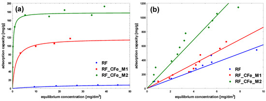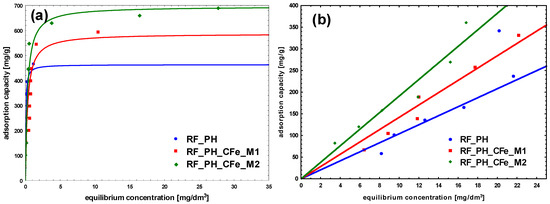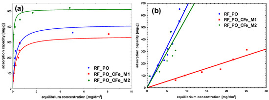 The adsorption of methylene blue on carbon materials is heavily influenced by pore size. Mesopores enhance adsorption kinetics significantly, while micropores, although contributing to capacity, limit the rate of adsorption. Optimizing pore size distribution is a key to improve both the speed and effectiveness of dye-adsorption processes. Larger pore sizes provide less resistance and higher mobility for adsorbate molecules. To maximize adsorption efficiency, the pore size distribution of the adsorbent should be optimized to match the dimensions of the MB cation, ensuring sufficient mesopore content to facilitate effective dye adsorption [43,44]. The size of MB cation is about 1.5 × 1 × 0.5 nm [45]. For the reference non-activated sample, the lowest levels of the affinity of binding sites, as well as the maximum adsorption capacity of the monolayer was noticed. The highest value of b constant was obtained for the sample modified using M2 method, RF_CFe_M2 (Figure 9 and Table 2). Activation of carbon materials resulted in an improvement of the value of maximum adsorption capacity of the monolayer, which can be ascribed to the increased specific surface area of the material. The highest affinity of binding sites was calculated for the sample RF_PO_CFe_M2. Considering the values of the obtained equation constants, it can be stated that the sample RF_PO_CFe_M2 expresses considerably high sorption abilities towards MB. The highest value of b constant (27.5) from the Langmuir equation indicates strong interaction of MB with the surface of this adsorbent. KOH-activated samples have a very high mesoporous range and is the superior pore size for MB adsorption. Unfortunately, the adsorption capacity in these samples is lower than in samples activated with potassium oxalate. This is probably related to the structure of pores in these samples. The presence of H4-type hysteresis loops was confirmed in samples activated with potassium oxalate. The H4 hysteresis loop is indicative of narrow slit-like mesopores. In the samples activated with potassium hydroxide, a mixed type of hysteresis loop composed of H2- and H4-type was noticed, what suggests that the pore types are various, and that the distribution of pore diameter is relatively large, when the pore shape is neck-like, wide, or ink bottle-like. The movement of MB adsorbate in this type of pore may be restricted and more gradual. In the case of CR adsorption, the highest partition coefficient was noticed for RF_CFe_M2. These results suggest that the activation process affects the surface of the adsorbent. Congo red dye possesses hydrophilic sulfonate groups, and interacts strongly with the carbon surface containing a higher number of oxygen groups. On the other hand, MB particles prefer hydrophobic than hydrophilic active sites.
