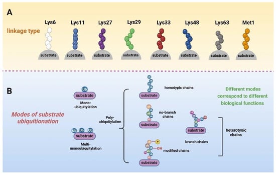 Schematic representation of how ubiquitin is linked to substrates, with differently coloured spheres representing ubiquitin molecules linked by different sites. (A) Both Met1 and the seven Lys residues in ubiquitin can form specific chain bonds with different conformations. (B) Substrates can be modified by mono-, multi-mono-, or polyubiquitin. Polyubiquitin includes homo- and hetero-chains. Heterodimeric chains include both homo- and heterodimeric chains, and heterodimeric chains have branched forms in addition to straight chains. In addition, ubiquitin is affected by other post-translational modifications, such as phosphorylation and hydroxylation.