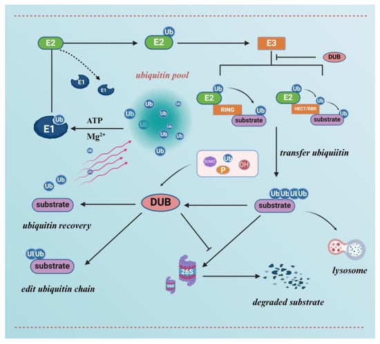 Ubiquitin, a small-molecule protein consisting of 76 amino acid residues, is widely found in a variety of eukaryotic organisms. It was first identified from reticulocytes and is called APF-1, and it is a key factor in the ATP-dependent hydrolysis of substrate proteins [4]. Remarkably, ubiquitin proteins are among the most conserved proteins known. There are only three different amino acid residues between ubiquitin in yeast and humans, which makes ubiquitin functionally interchangeable and universal across species [5,6]. Ubiquitin primarily labels proteins that need to be degraded and then mediates the degradation of target proteins via the ubiquitination–proteasome and lysosomal pathways. Diverse ubiquitin chains influence the biological function of target proteins. For example, the activity of certain transcription factors can be enhanced by self-ubiquitination or by interaction with specific ubiquitin ligases [7,8]. The de-ubiquitination of proteins refers to reversing the ubiquitination process by the operation of de-ubiquitinating enzymes (DUBs) [9]. Ubiquitination and de-ubiquitination mediate approximately 80–85% of the protein degradation in eukaryotic cells [10]. Together, they maintain the homeostasis of the intracellular environment and the integrity of organelles and play a crucial role in protein location, metabolism, function, regulation, and degradation [11].