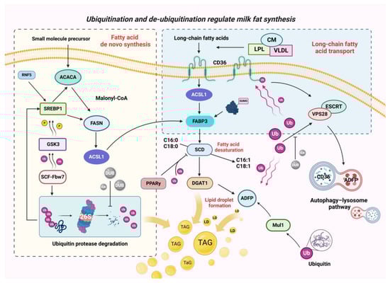 The main component of milk fat is triglyceride, which accounts for 95~98% of the total milk fat. Milk fat globules (MFGs), which are wrapped in a phospholipid membrane, are the only form of milk fat. In addition, milk fat also contains small amounts of phospholipids, cholesterol, and free fatty acids, which are further divided into saturated and unsaturated fatty acids [61,62]. The biology of lactation in dairy cows has established that fatty acids and glycerol for the synthesis of triglycerides in milk fat originate from two main pathways: absorption from the blood and self-synthesis in mammary epithelial cells [63]. However, both directly absorbed fatty acids and short- and medium-chain fatty acids synthesised from scratch need to be transported, activated, lengthened, and desaturated by a series of enzymes in the cell before triglycerides can finally be synthesised. Thus, the process of milk lipid production requires precise regulation by a series of receptor–ligand binding, transport carriers, and enzymes, while the activation and degradation of these molecules require the dynamic regulation of ubiquitination and de-ubiquitination.