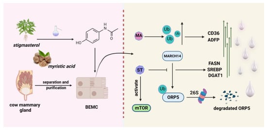A model for the promotion of milk fat synthesis in dairy cow mammary cells through the ubiquitination pathway by soysterols and myristic acid. Soysterols promote CD36 and ADFP expression by increasing intracellular ubiquitination levels. Myristic acid promotes fatty-acid-synthesis-related gene expression by antagonising the MARCH14-mediated ubiquitination degradation of ORP5. In addition, myristic acid activated the mTOR signalling pathway to assist milk synthesis.