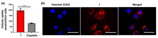 (a) Cellular accumulation of 1 ([Pt] = 2 µM) and cisplatin ([Pt] = 20 µM) in MDA-MB-231 cells; (b) images of MDA-MB-231 cells treated with 1 (2 μM, 24 h) and labeled with Hoechst for 3 h at 37 °C, 5% CO2. Scale bar = 100 µm. *** p < 0.001 by t test (n = 3, mean ± SEM).
