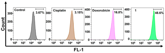 MDA-MB-231 cells were seeded in a 6-well plate at a concentration of 2 × 105 cells/well. The cells were then incubated at 37 °C with 5% CO2 for 24 h. Next, 1 (1 μM), doxorubicin (1 μM), or cisplatin (10 μM) was then added and incubated for 24 h. The primary goal was to demonstrate that complex 1 can significantly higher levels of γH2AX compared to those treated with cisplatin or doxorubicin, even when a higher dosage of cisplatin was used. Through numerous pilot experiments with varying concentrations, we determined that the concentrations used in this study were optimal for obtaining measurable results. The live cells were collected, 250 μL BD permeabilization solution was added to resuspend the cells, and then the cells were incubated for 20 min at 4 °C. The cell pellets were then collected, washed twice with 1× BD Perm/Wash buffer, and resuspended in 50 µL of buffer. The samples were treated with Alexa 488-anti γH2AX antibody solution and incubated in the dark at room temperature for 60 min. The final cell pellets were resuspended in 200 μL of PBS containing 0.5% BSA. Then, they were analyzed with BD Accuri C6 flow cytometer using the FL-1 channel. The data were analyzed using FlowJo, version 10.8 (FlowJo LLC, Ashland, OR, USA).