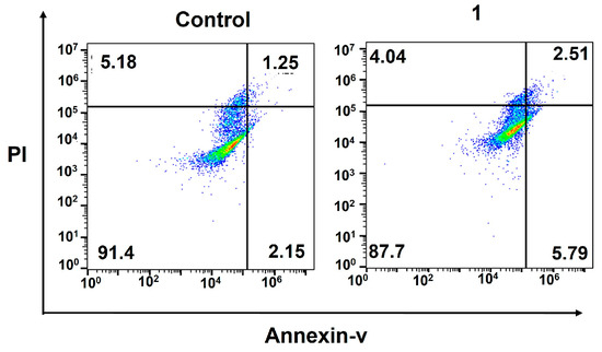 MDA-MB-231 cells were seeded in a 6-well plate at a concentration of 2 × 105 cells/well. Cells were then incubated at 37 °C, 5% CO2 for 72 h. Next, 1 (0.5 μM) was added and incubated for 72 h. Both viable and nonviable cells were collected, resuspended in 1 mL of phosphate-buffered saline (PBS), and quantified. Then, 1× binding buffer from an FITC Annexin V Apoptosis Detection Kit 1 (BD Biosciences, Franklin Lakes, NJ, USA) was added to achieve a concentration of 106 cells/mL. The 100 µL cell solution was transferred to a fresh 2 mL Eppendorf tube, and both Annexin V-FITC and PI solutions were added to the cells. The cells were incubated for 15 min at room temperature in the absence of light and then diluted to a volume of 400 µL by adding the appropriate amount of binding 1× buffer. Cells were then analyzed with FL-1 and FL-3 channels on a BD Accuri C6 flow cytometer and the subsequent datasets were analyzed using FlowJo, version 10.8 (FlowJo LLC, Ashland, OR, USA).