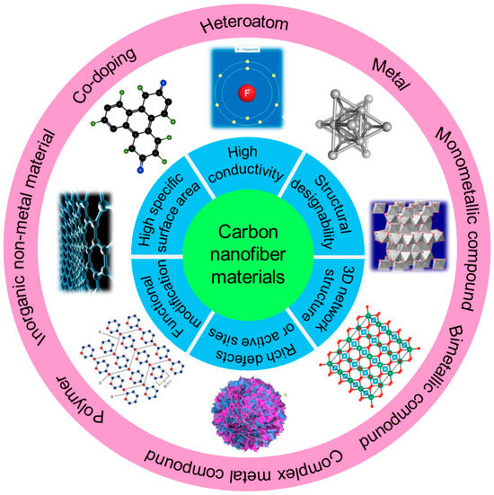 Although CNFs have shown excellent performance in stabilizing lithium anodes, most of them are non-polar materials with weak interactions with Li+. Lithiophobic carbon surfaces are not conducive to the nucleation and deposition of lithium, and can only regulate the deposition behavior at the physical level. Therefore, researchers have attempted to introduce lithiophilic materials into carbon substrates to obtain CNF-based composites, including heteroatom, metal, metal compounds, inorganic non-metal material, polymer and co-doping.