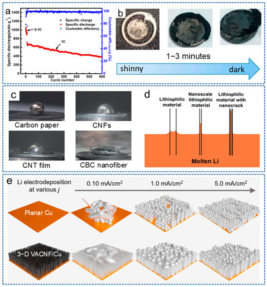 (a) The cycling performance of the battery at 1 C. (b) The surface of the battery with the anode interlayer after 100 cycles at 0.1 C [64]. Copyright 2017, MDPI. (c) The contact angle of different materials. (d) Capillary force at different nanoscale materials [65]. Copyright 2023, Springer. (e) The effect of plating current density on lithium deposition morphology on planar Cu and VACNF/Cu electrodes, respectively [66]. Copyright 2024, Elsevier.
