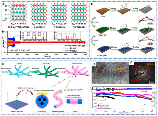 (a) DFT adsorption geometry and energy of lithium atoms on TiNbO4 (100) surface, including O vacancy, Ti vacancy, Nb vacancy. (b) Voltage-time profiles of different symmetrical cells at 2 mA cm−2 and 2 mAh cm−2 [104]. Copyright 2023, American Chemical Society. (c) Schematic illustration of lithium deposition in the different scaffold [106]. Copyright 2022, Elsevier. (d) Schematic illustration of synthesis process and working mechanism of ZnO-Co3O4/CNF [107]. Copyright 2023, Elsevier. (e) High-resolution transmision electron microscope image and (f) selected area electron diffraction pattern of ZnF2/ZnS/NC/PCNFs. (g) Cycling performances of Li|LFP batteries with ZnF2/ZnS/NC/PCNFs interlayer at 1 C [58]. Copyright 2022, Elsevier.