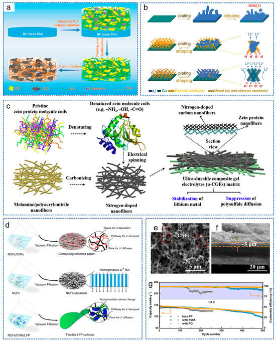(a) Schematic illustration of the preparation process for BC-CNF@rGO [113]. Copyright 2022, Wiley-VCH. (b) Schematic illustration of lithium plating/stripping behavior on different electrode [114]. Copyright 2018, Wiley-VCH. (c) Schematic illustration of fabrication process for u-CGE [115]. Copyright 2020, Elsevier. (d) Schematic illustration of the preparation process for NCFs-based separator and electrodes [116]. Copyright 2018, American Chemical Society. (e) Top-view and (f) cross-sectional SEM images of PP with PCI. (g) Cycling performance of cells at 1 C [117]. Copyright 2020, Elsevier.