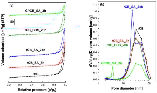 The influence of applied modification on the porosity of rCB samples: (a) nitrogen adsorption–desorption isotherms, (b) pore size distributions.