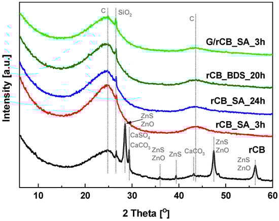 Powder XRD analysis of all the rCB samples is depicted in Figure 3. As shown, the initial rCB material exhibits an amorphous structure evidenced by a broad signal at 2θ with a maximum at around 24° (002 crystal plane) and a weak reflection at 2θ around 43° (100 crystal plane), typical for carbon materials [53]. The PXRD pattern of the rCB material also reveals the presence of impurities, mainly zinc in the forms of ZnS and ZnO, characterized by peaks at 2θ around 28.5°, 36°, 48°, and 56° [54,55,56,57]. Moreover, CaCO3 and CaSO4 compounds are indicted by a signal at 2θ equal to 29°, while SiO2 is identified by a small reflection at 2θ equal to 26.6° [54,55]. Additionally, the reflection at ca. 2θ around 43° observed in the initial rCB sample confirms the presence of CaCO3. The presence of such compounds results from tire compositions [58,59] and their persistence as residue after the pyrolysis process [56]. This also aligns with the ash content data presented in Table 2.