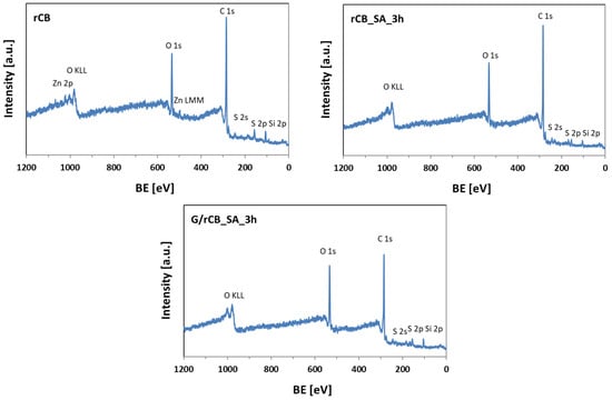The surface chemical structure of selected samples was analyzed using X-ray photoelectron spectroscopy (XPS). The survey spectra of the initial rCB and a selected modified material in Figure 4 displayed well-resolved C 1s and O 1s peaks, along with lower-intensity peaks corresponding to Si 2p, Zn 2p, and S 2p for rCB, as well as to Si 2p and S 2p in functionalized carbons. According to the data presented in Table 3, rCB contained sulfur in its structure, which aligns with the data from elemental analysis (EA) shown in Table 2. Unlike EA, the XPS method revealed a very high oxygen content in the sample. This discrepancy is attributed to XPS’s ability to detect oxygen in various chemical forms on the surface, such as salts or oxides, whereas in EA, oxygen must be fully released and converted to a gaseous form for detection. Importantly, the functionalized samples exhibited an increased sulfur content compared to rCB, suggesting the successful introduction of new functionalities onto the carbon surface during the modifications.