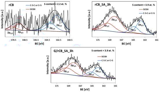 A high-resolution XPS S2p spectra of rCB and selected modified carbons (Figure 5) showed that sulfur was present in the samples in different oxidation states. All the spectra exhibited signals around 164 and 168 eV (observed as a doublet), which can be attributed to the reduced and oxidized forms of S, respectively [23,60]. The contribution of these signals, however, varied between samples. In the rCB, sulfur was predominantly in the reduced form (peaks at 163.8 and 165.0 eV, assigned to -C-S-C- sulfide bridges, dominated) [61]. Conversely, in the functionalized carbons, sulfur was primarily in its oxidized state, with a high-energy doublet at 167.9 and 169.1 eV attributed to the -C-SOx-C- groups (where x = 2 or 3) being dominant [23,62]. This indicates the successful introduction of -SO3H groups during the functionalization (Figure 5). The relative concentrations of different S-containing surface groups are summarized in Table 4.
