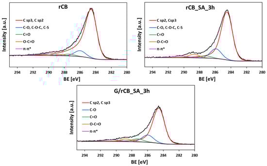Figure 6 shows high-resolution XPS C 1s spectra of the initial rCB and selected modified samples. All these spectra can be deconvoluted into peaks centered at ~284.5 eV, 285.9 eV, 287.3 eV, 289.6 eV, and 290.6 eV (±0.1–0.2 eV in each case), typically assigned to (i) sp2 and sp3 hybridized carbon, (ii) C-O in hydroxyl/phenolic and ether groups and C-S, (iii) C=O in carbonyls, (iv) O-C=O in carboxylic acids, esters, and inorganic carbonates, and (v) π–π* transitions, respectively [23,65,66]. The relative abundance of different carbon species derived from the deconvoluted spectra is listed in Table 5. The results show that graphitic carbon predominates in all investigated samples, constituting more than 66%. The samples also contain a relatively high amount of moieties in which carbon is singly bound to an oxygen atom (C-O).