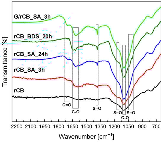 Figure 7 presents the FT-IR spectra of the initial rCB and the modified samples. As observed, rCB exhibits a broad band with a maximum of about 1100 cm−1, which is attributed to the presence of carboxyl groups [8]. This band overlaps with the band characteristic of the O=S=O group. Analysis of FT-IR spectra of acid-modified materials (Figure 7) shows that treatment with sulfuric acid and BDS generates new bands at about 1040 and 1380 cm−1, as well as a weak band at 1183 cm−1 [67,68]. According to Zhao et al. [68], these bands indicate the formation of SO2 (O=S=O) asymmetric and symmetric stretching vibrations. Notably, the bands at about 1380 cm−1 (stretching vibration of SO3) and 1040 cm−1 (stretching vibration of SO3H) are more pronounced for rCB modified with glucose followed by sulfonation compared to those directly sulfonated. Additionally, according to the literature [69], bands at approximately 1710 cm−1 and 1650 cm−1 indicate the presence of carboxyl and carbonyl bonds in acidic surface groups. This finding is consistent with the acidity measurement results (Table 2).