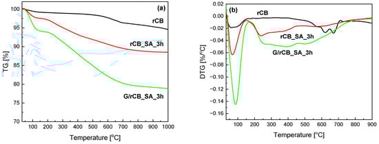 Thermogravimetric analysis performed under an inert gas flow further reflects the effectiveness of sample functionalization. Figure 8 shows the results of the TG and DTG analyses carried out for the initial recovered carbon black (rCB) and selected samples after functionalization. As observed in Figure 8a, rCB shows a slight weight loss in two temperature ranges seen in the DTG curves (Figure 8b). A small initial effect (~1% weight loss) was recorded in the temperature range of 25–100 °C due to the presence of physically adsorbed water. The second weight loss (~3%) in the range of 530–700 °C is likely related to the presence of inorganic additives identified as ash contents (refer to Table 2 and PXRD patterns in Figure 3) and further carbonization of a rubber-derived carbonaceous solid [70]. This effect is not pronounced in the modified materials, confirming the partial removal of mineral matter and impurities from the pure rCB material during treatment with sulfuric acid. In contrast, the modified materials exhibited significantly lower thermal stability compared to the parent sample, indicating efficient functionalization with new functional groups. Notably, a higher weight loss of approximately 11% was observed for the sample treated with sulfuric acid (rCB_SA_3h) and around 20% for the composite of rCB with glucose (G/rCB_SA_3h). This observation is also consistent with the S and O contents reported in Table 2. The weight loss for the modified samples is observed in two ranges: around 100 °C (for rCB_SA_3h—weight loss of 2% and G/rCB_SA_3h—6%) and broad signals in the temperature ranges of approximately 200–750 °C, with maxima at around 250, 400, and 510 °C (Figure 8b). The significantly higher mass loss at low temperatures, resulting from water removal, may be attributed to the more hydrophilic nature of the samples after modification due to the high density of hydrophilic functional groups bound to carbon. According to the literature data, the weight loss in the second-stage temperature range may be due to the decomposition of sulfonate groups present on the surface of the samples, as well as the presence of oxygen functional groups [71,72]. A similar effect was observed in our earlier work [23]. The presence of such groups results from the oxidizing properties of concentrated sulfuric acid [23]. In the case of the G/rCB_SA_3h composite, the oxygen-rich sample structure is also due to the method of preparation (see also Materials and Methods); i.e., low-temperature treatment of glucose typically produces oxygen-abundant (hydro)char [73]. The presence of these effects confirms the effective introduction of functional groups on the surface of the studied rCBs.