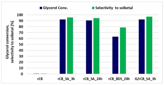 Among the two modifiers used to introduce sulfonic groups onto the carbon material, treatment with sulfuric acid yielded significantly better results when compared to BDS alteration (Figure 9). Glycerol conversion on rCB treated with sulfuric acid (SA) for 3 h exceeded 92%, with a selectivity of 96% for the desired product, solketal. On the other hand, the introduction of glucose onto the surface of the rCB material with the following partial carbonization and sulfonation did not affect glycerol conversion and only slightly improved selectivity to solketal. In contrast, the sample modified with 4-benzenediazonium sulfonate (BDS) achieved only 60% glycerol conversion and 78% selectivity to solketal. Along with solketal, a small amount of the isomeric compound 1,3-dioxan-5-ol was also produced. The reaction between glycerol and acetone is a reversible process, resulting in the formation of 2,2-dimethyl-1,3-dioxolane-4-methanol (solketal), isomer, and water (as illustrated in Scheme S1).