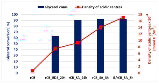 The modifications with sulfuric acid (SA) and 4-benzenediazonium sulfonate (BDS) lead to the formation of active sites with acidic functions, as shown in Table 2. The increase in glycerol conversion correlates with a higher density of acid sites (Figure 10, Table 2). The importance of Brønsted acidic functions in the glycerol acetalization reaction with acetone has been highlighted in numerous studies [42,43,44,45]. In the proposed mechanism, the activation of the acetone carbonyl group by the hydrogen of the SO3H group occurs, followed by a nucleophilic attack by the alcohol group of glycerol, leading to the formation of a bond between the carbonyl oxygen atom and the β-carbon of glycerol. This process results in dehydration and the formation of the five-membered ring of solketal (Scheme S2).