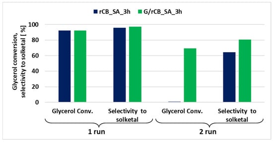 Not only activity but also the stability of catalysts is a crucial factor for their feasibility in industrial-scale applications. To assess their potential for reuse, the acetalization reaction of glycerol with acetone was tested using both a sulfonated catalyst and rCB impregnated with glucose followed by the sulfonation process. The activity of these catalysts was evaluated over two reaction cycles (Figure 11). All catalysts exhibited satisfactory initial activity, with glycerol conversion exceeding 92% and selectivity for solketal reaching 97%. However, the rCB_SA_3h catalyst, which was solely functionalized through sulfonation, showed a dramatic decrease in activity to below 1% in the second cycle. In contrast, only the catalyst obtained through the dual functionalization process—impregnation with glucose followed by partial carbonization and sulfonation—remained active in the second cycle. For this catalyst, glycerol conversion exceeded 69%, and the selectivity to solketal was around 80%.