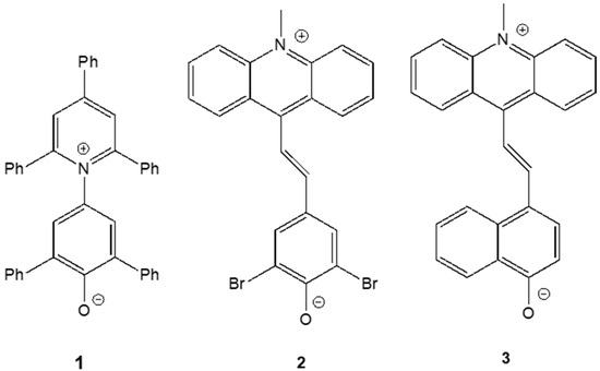 Compound 1, Reichardt’s betaine, has been a subject of permanent interest [14,15,16] because of its various applications as an indicator and basis of the ET(30) polarity scale [22,23,24,25]. It is a classic example of a dye that exhibits negative solvatochromism. Compound 2 has been described by El Seoud et al. as a merocyanine that unquestionably exhibits a reverse behavior [20]. Finally, compound 3 is a classic example of another merocyanine showing positive solvatochromism [21].