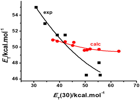 Comparison of the experimental (black squares) [20] and calculated (red circles) solvatochromic plots of dye 2 in various solvents.