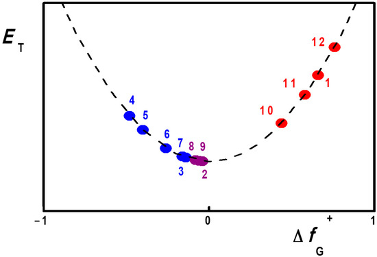 Schematic representation of the solvatochromic behavior of phenolate betaines 1–12 as a function of the difference ΔfG+ between the group Fukui electrophilic functions of their charge-transferring fragments A–B. Solvatochromic transition energies ET vary with the relative electrophilicities of the two conjugated fragments, expressed in terms of their Fukui electrophilic functions. Dyes exhibiting negative solvatochromism (1,10–12) are shown in red, those exhibiting a positive behavior (3–7) are depicted in blue, those with an inverted behavior (2,8,9) in purple.
