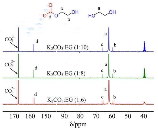 At first, three DESs K2CO3:EG (1:6), (1:8), and (1:10) were prepared. The 13C NMR spectra of these K2CO3-EG DESs were recorded using DMSO-d6 as an external solvent. Namely, the interactions between K2CO3 and EG were not disturbed by DMSO-d6. As shown in Figure 1, there are three new carbon peaks C-b, C-c, and C-d besides the carbon and -CH2- carbon (C-a) of EG for each K2CO3-EG used. The three new peaks can be found at 59.6 (C-b), 65.8 (C-c), and 157.7 (C-d) ppm for K2CO3:EG (1:8). The new peaks C-b and C-c are attributed to the -CH2- carbons of HO-CH2-CH2-O-COO− carbonate, and the peak C-d is attributed to the carbonyl carbon of HO-CH2-CH2-O-COO− [23,24,25]. The 13C NMR spectra of K213CO3:EG (1:8) were also investigated. As shown in Figure 2a, the carbon peaks C-b, C-c, and C-d can be observed. The C-d peak in K213CO3:EG (1:8) is significantly enhanced relative to that in K2CO3:EG (1:8), suggesting that C-d carbon comes from K213CO3. In other words, C-d carbon in K2CO3-EG DESs is from the carbon of K2CO3. Interestingly, there is another weak peak at 157.4 ppm (Figure 2a), which can be ascribed to the carbonyl carbon of the dianion −OOC-O-CH2-CH2-O-COO− [26]. This peak is not detected in K2CO3-EG systems, which may be due to its low concentration in K2CO3-EG DESs.