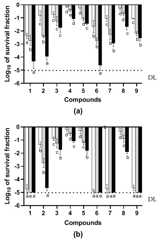 (a): Logarithmic survival fraction of Escherichia coli O157:H7 after 5 h treatment at room temperature in pH 7.0 citrate-phosphate buffer or (b): pH 4.0, in the presence of 0.2 μL/mL of the following pure constituents: α-terpinyl acetate (1), terpineol 4-ol (2), carvacrol (3), thymol (4), (+)-limonene (5), citral (6), linalool (7), 1,8-cineole (8), p-cymene (9). Survivors were recovered in nonselective TSAYE (☐), in selective medium added with sodium chloride (TSAYE-SC) (