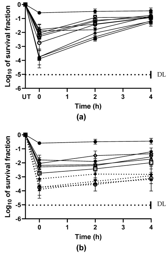 Biosynthetic requirements for the repair of sublethal injury caused in E. coli by exposure to essential oils constituents: α-terpinyl acetate (∆), terpineol 4-ol (◊), carvacrol (▲), thymol (■), (+)-limonene (▼), citral (□), Linalool (▽), 1,8-cineol (o), p-cymene (♦). Cells were exposed to 0.2 µL/L of EOCs for 3 h at pH 7.0, and then inoculated to subsequent incubation for 4 h at 30 °C in TSBYE (●,○) and into this medium containing penicillin G, (a) or without penicillin G (b). Survivors were recovered in nonselective medium (TSAYE) (●) and selective medium added with sodium chloride (TSAYE-SC). UT, untreated. Data represent mean ± standard deviation (error bars). DL: The dotted line represents the detection limit.