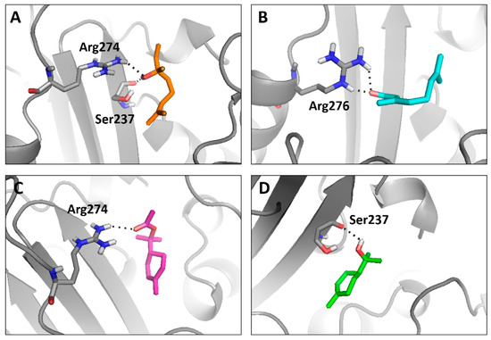 3D diagram of lowest-energy model of Toho-1 complexes. Selected residues at the active site of Toho-1 are marked in sticks; remaining enzyme gray colored cartoon, ligands are in different colors; (A) linalool, (B) citral, (C) α-terpinyl acetate, and (D) α-terpineol. The H-bonds are shown as dashed black lines.