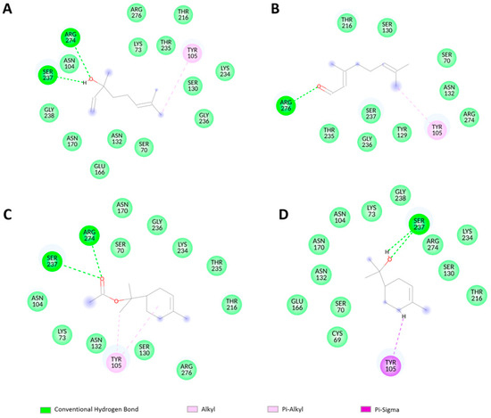 A2D diagram of the intermolecular interactions between ligands and Toho-1 depicted using Discovery Studio Visualizer. Ligands are in different colors; (A) linalool, (B) citral, (C)α-terpinyl acetate, and (D) α-terpineol. Residues are differentiated by colors.
