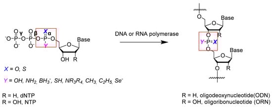 As a key class of nucleoside triphosphate analogs, α-P-modified nucleoside triphosphates (NTPαXYs) have long been recognized as versatile tools in molecular biology and medicinal chemistry []. The α-phosphate moieties are especially important because after cleavage of the pyrophosphate, phosphate-modified units are incorporated into a long nucleic acid strand (Scheme 1). In comparison to β- and γ-P-modified NTPs, the most distinct feature of NTPαXYs is their recognition by polymerases. This feature makes it possible to incorporate S-, Se-, or BH3-modified phosphate linkages into DNA and RNA. As a result, NTPαXYs have become a multifunctional tool for various purposes. For instance, it is known that nucleoside 5′-(α-P-thio)triphosphates (NTPα-Ss) [] and nucleoside 5′-(α-P-borano)triphosphates (NTPα-Bs) [] can be easily incorporated into nucleic acids using DNA or RNA polymerases [].