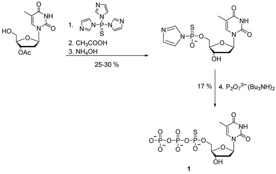 Nucleoside 5′-(α-P-thio)triphosphates were initially obtained by activation of nucleoside 5′-phosphorothioates followed by the addition of pyrophosphate. For the first time, the preparation of 5′-(α-P-thio)nucleoside triphosphate by a chemical method was proposed by F. Eckstein in 1967 []. Thymidine 5′-(α-P-thio)triphosphate 1 was synthesized with 5% yield by the so-called triimidazolyl-phosphine sulfide method, which involved a reaction of 3′-O-acetyl-thymidine with an excess of triimidazolyl-1-phosphine sulfide. The product was thymidine 5′-phosphoromonoimidazolothioate, which was then treated with pyrophosphate to obtain desired product 1 (Scheme 2).