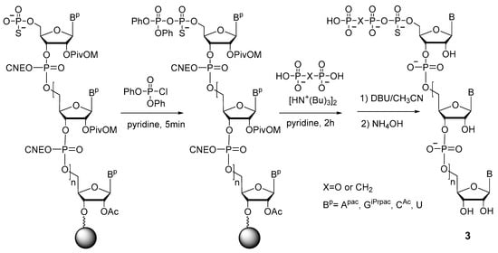 The authors of the work [] (Y. Thillier et al.) were the first to describe a convenient and effective technique for obtaining 5′-(α-P-thio)triphosphates of oligonucleotides on a solid support. Their strategy is similar to the one described above []: activation of 5′-phosphorothioate with diphenyl phosphorochloridate, with subsequent substitution by pyrophosphate (Scheme 5). The 5′-(α-P-Thio)triphosphate and 5′-(α-P-thio)(β,γ-methylene)triphosphate oligonucleotides 3 were prepared in good yields ranging from 30% to 50%. Of note, this method proved to be more successful for obtaining 5′-(α-P-thio)triphosphate oligonucleotides on a solid phase as compared to other techniques, involving the use of phosphoramidate or salicylphosphite intermediates [].