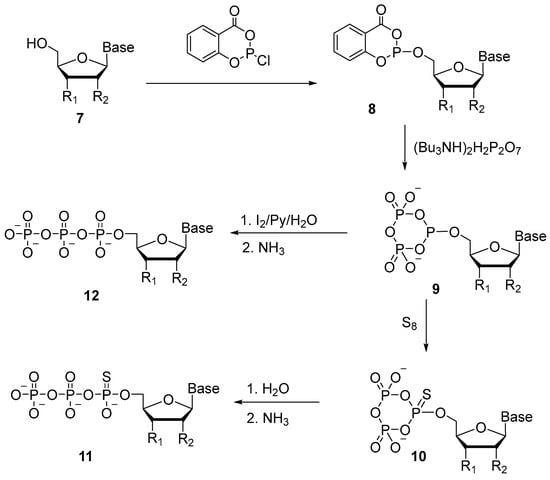 Since 1989, the approach proposed by F. Eckstein and J. Ludwig has been used predominantly for the synthesis of 5′-(α-P-thio)triphosphates []. The key to this approach is the formation of 5′-cyclotriphosphite 9. Salicyl chlorophosphite has been utilized as a phosphitylation reagent (Scheme 7), and the reaction with nucleoside 7 gives two diastereomers 8. Next, after the addition of pyrophosphate, the formation of cyclic intermediate 9 takes place. This intermediate in the presence of elemental sulfur gives rise to 5′-α-P-thio-cyclotriphosphite 10, aqueous hydrolysis of which produces 5′-(α-P-thio)triphosphate 11. The authors confirmed that the ring opening occurs precisely at the bond between α-phosphate and γ-phosphate through hydrolysis with H218O. Considering this, cyclic intermediate 9 can be oxidized with an aqueous solution of iodine to obtain native triphosphates 12.