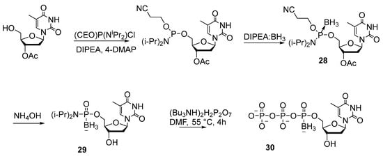 Synthesis of thymidine 5ʹ-(α-P-borano)triphosphate 30 by the amidophosphite method [].