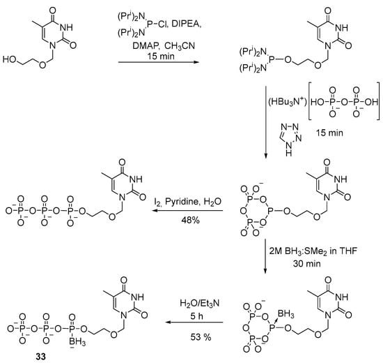 A similar technique was employed to obtain a 5′-(α-P-borano)triphosphate derivative of acyclothymidine 33 []. The method involves tetrazole as a catalyst for the reaction of substitution of diisopropylamide groups with pyrophosphate (Scheme 14). After final purification, the yield of product 33 was 53%.