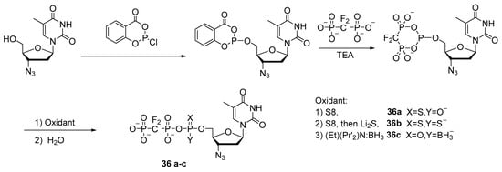 In a similar way, Wang et al. synthesized 3′-azidothymidine-5′-triphosphate mimetics with 5′-α-P-borano, 5′-α-P-thio, or 5′-α-P-dithio substitutions 36a–c with moderate-to-good yields [] (Scheme 16), and in work [], also with 5′-α-P-selenium substitutions.