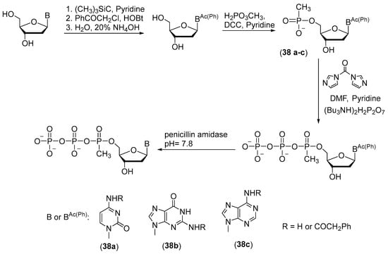 To obtain nucleoside 5′-(α-P-alkyl)triphosphates, activation of nucleoside 5′-O-(alkyl)phosphonates and subsequent addition of pyrophosphate are performed. Dineva et al. used diphenyl phosphorochloridate to activate thymidine 5′-methylphosphonate (Scheme 17) []. The reaction took place within 15 min. The activated intermediate product was isolated and then treated with pyrophosphate. The yield of thymidine 5′-(α-P-methyl)triphosphate 37 was 28%.