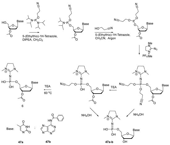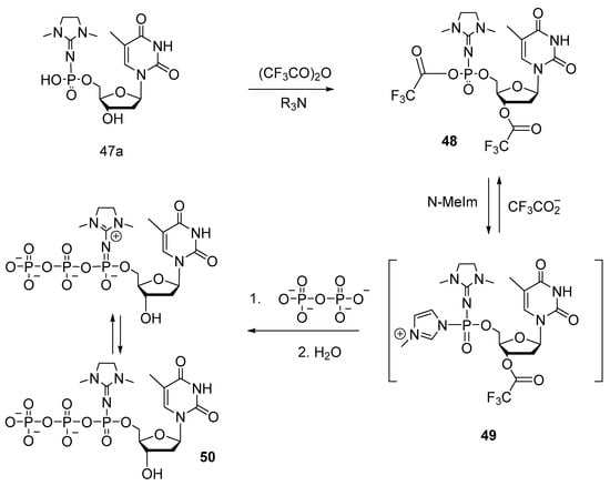 Lately, S. Vasilyeva et al. developed protocols for the synthesis of 5′-(α-P-imido)-modified mononucleotides []. Scheme 23 shows the synthesis of 5′-(α-P-dimethylimidazolyl)phosphate of thymidine and adenosine (47a,b) from 5′-phosphoramidites of protected nucleosides, with 34–64% yields. The phosphoramidite was converted to 5′-triester phosphite, which interacts via Staudinger’s reaction with 2-azido-1,3-dimethylimidazole, yielding, after deprotection, nucleoside 5′-(α-P-imido)triphosphates 47a,b.