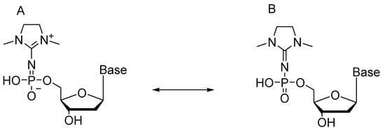 Later, by a similar method involving dichloroethylphosphonium, Holliger’s research group obtained 5′-(α-P-ethyl)triphosphates of 2′-deoxyadenosine, deoxycytidine, deoxyguanosine, and thymidine [], unfortunately, with very low yields: 1.0–1.5%.
