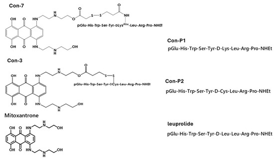 A different therapeutic approach against GnRH-dependent cancers is the GnRH-R-targeted therapy. Specifically, anticancer GnRH conjugates have been developed via linking through an ester bond, [D-Lys6] GnRH, with cytotoxic doxorubicin or its derivatives [12,32,33,34,35,36]. One of these analogs is called AN-152. AN-152 exerts its cytotoxic actions through its interaction with the GnRH-R in tumor cells, the internalization of the receptor–conjugate complex, and the subsequent intracellular release of doxorubicin. A drawback of this approach is the toxicity of doxorubicin and the vulnerability of these conjugates to plasma carboxylesterases, which cleave the ester bond between GnRH and doxorubicin, thus releasing the latter before reaching the tumors [33,34,35]. In the present study, we characterized the cytotoxic properties of the GnRH conjugates, Con-3 and Con-7, which have been created by our research team by linking modified leuprolide analogs with the less toxic anticancer agent, mitoxantrone, through a disulfide bond [37,38,39]. Specifically, mitoxantrone causes significantly less nausea, vomiting, diarrhea, anorexia, stomatitis, and alopecia and appears to be less cardiotoxic than doxorubicin [37,38]. The modified leuprolide analogs, which were used to create the Con-3 and Con-7, by linking them to mitoxantrone, are nine amino-acid peptides created by our research team and named Con-P2 and Con-P1, respectively (Figure 1). Specific, the Con-P1 and Con-P2 correspond to analogs 4 and 2 of our previous study, which were analytically described in the Supplementary Materials of this study [39].