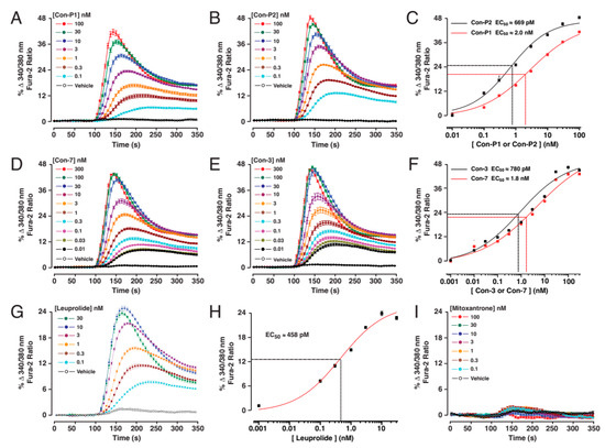 Real-time kinetic assays of GnRH-R agonist action in HEK293 cells. HEK293 cells transfected with the human GnRH-R served as a platform with which to test for agonist actions of individual test compounds. These cells were loaded with the ratiometric Ca2+ indicator fura-2 so that the change in intracellular [Ca2+] in response to agonist stimulation could be monitored in real time in a 96-well format. For these assays, the individual test compounds were administered at the 100 s time point. Note that the y-axis values are expressed as the % 340/380 nm fura-2 emission ratio in which an increase in the ratio signifies an increase of [Ca2+]. Concentration–response studies demonstrated the Ca2+-elevating agonist properties and EC50 values for Con-P1 and Con-P2 (A–C) or Con-7 and Con-3 (D–F). Leuprolide also acted as a GnRH-R agonist (G,H), whereas unconjugated mitoxantrone was without effect (I).