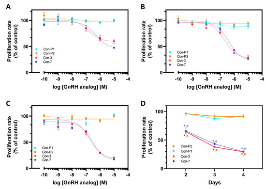 Antiproliferative activity of the GnRH analogs. Decrease in the proliferation rate of the SKOV3 cells after their treatment with increasing concentrations of Con-3, Con-7, Con-P1 or Con-P2 for 2 days (A), 3 days (B) and 4 days (C) at 37 °C. At the end of the incubation, the cells were further incubated with 0.5 mg/mL MTT for 4 h at room temperature and the formed purple formazan crystals were quantified by measuring absorbance at 594 nm. The means ± S.E (triplicate determination) are shown from a representative experiment performed 3 times with similar results. The proliferation rates of cells treated with 1 μΜ of GnRH analogs were used to plot the graph D which depicts the decrease in cell growth over the incubation time (D). Statistical analysis was performed using one-way ANOVA. The asterisk symbols indicate the proliferation rates of cells treated with Con-3 or Con-7 which were significantly different from that of untreated cells (controls) (p ˂ 0.05). The pound symbols indicate proliferation rates of cells treated with Con-3 or Con-7 which were significantly different from those treated with Con-P2 or Con-P1, respectively (p ˂ 0.05).
