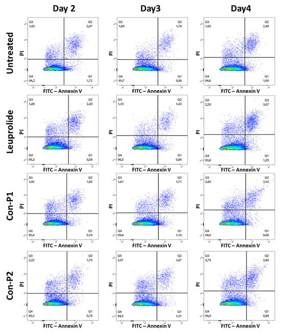 Determination of viability, apoptosis or necrosis of untreated SKOV-3 cells or treated with 1 μM leuprolide, Con-P1, or Con-P2 for 2, 3, and 4 days at 37 °C. At the end of the incubation the cells were further incubated in binding buffer supplied by Biotium, (CF488A Apoptosis Detection kit) and analyzed on a flow cytometer (excitation 488 nm), in the FITC channel (filter 530 nm) for the detection of the Annexin V-positive cellsand in the PI channel (filter 616 nm) for the detection of the PI-positive cells. The figures are from a representative experiment performed two or three times with similar results. A higher resolution of the images in Figure 6 is provided in the Supplementary Material (Figures S10–S21).