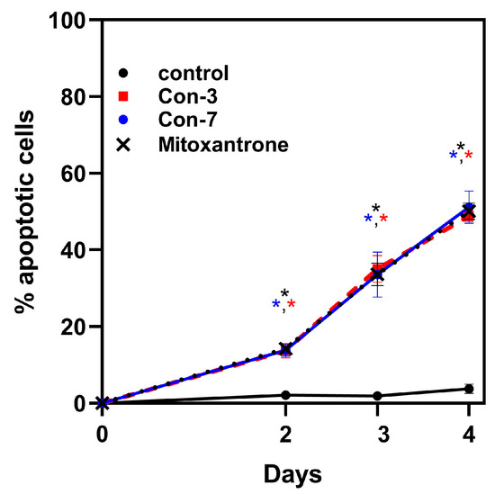 To demonstrate the importance of incubation time on cell apoptosis, we presented the flow cytometry data as a graph by plotting the time (days 2–4) versus the percentage of apoptotic cells after their treatment with Con-3, Con-7, or mitoxantrone at a concentration of 1 μM (Figure 7). This graph clearly demonstrates that the incubation time is a crucial parameter for cell viability because its extension from two to four days was associated with a significant increase in the percentage of apoptotic cells treated with the Con-3, Con-7 or mitoxantrone, compared to untreated cells, as shown in Table 1. In contrast, the incubation time did not alter the viability of the untreated cells (Figure 7).