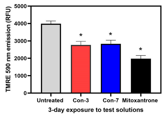 The apoptosis of SKOV3 cells by Con-3, Con-7 and mitoxantrone was further validated in a mitochondrial membrane potential (ΔΨm) assay, which utilizes the cell-permeable, cationic dye, tetramethylrhodamine ethyl ester (TMRE) to detect the ΔΨm. TMRE accumulates in healthy mitochondria with polarized membrane, but not in the mitochondria of apoptotic cells. Mitochondrial permeabilization and the loss of the mitochondrial transmembrane potential are associated with cell apoptosis and a drop in fluorescence of TMRE [40]. As shown in Figure 8, treatment of SKOV3 cells with Con-3, Con-7 or mitoxantrone for 3 days significantly reduced the accumulation of the TMRE and thus its fluorescence, indicating loss of mitochondrial membrane potential.