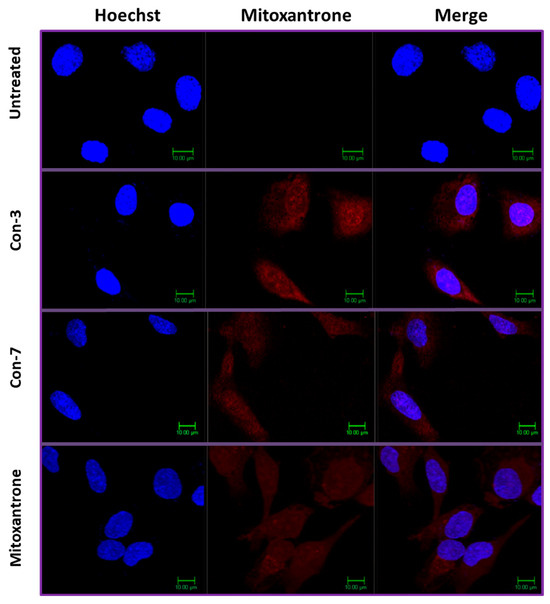 To determine the accumulation of mitoxantrone within the SKOV-3 cells, we used confocal microscopy, exploiting the ability of mitoxantrone to fluoresce [41]. Specifically, the excitation maxima of mitoxantrone are at 610 and 660 nm, whereas its emission maximum is at 685 nm. To stain the nuclei, we used the Hoechst dye [42]. To demonstrate the nuclear localization of mitoxantrone, we merged the images showing the localization of Hoechst dye with those depicting the mitoxantrone fluorescence. As shown in Figure 9, mitoxantrone fluorescence is detected in both the cytoplasm and nucleus of the SKOV-3 cells after 6 h treatment with 1 μM of Con-3, Con-7 or mitoxantrone. In contrast, the fluorescence signal was absent in untreated cells. Interestingly, the fluorescence intensities, and therefore the intracellular concentrations, of the free mitoxantrone and the conjugated one with the GnRH analogs in Con-3 and Con-7 were similar (Figure 9), as confirmed by the quantification of their fluorescence intensities using Image J software (1.54j, U.S. National Institutes of Health, Bethesda, MD, USA)and t-test statistical analysis of the results (Table 2).