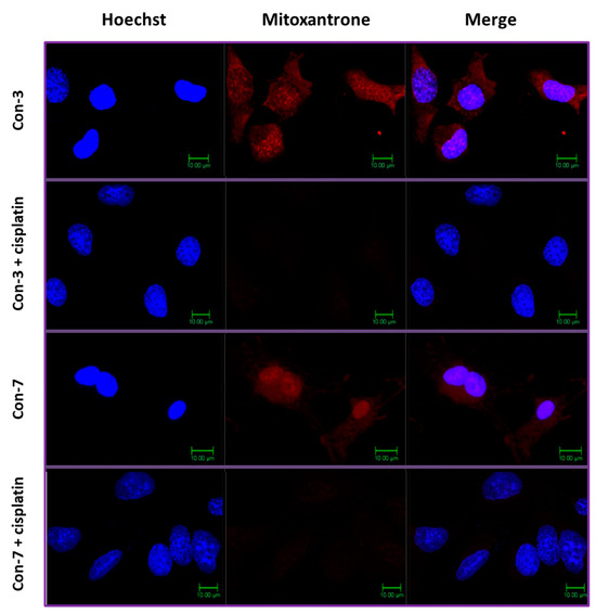 Quantification of the fluorescence intensity of confocal microscopy images after 6 h incubation of cells with the compounds (Figure 9, Figure 10 and Figure 11). The quantification of fluorescence intensity was accomplished using the Image J software. Specifically, the fluorescence intensity of 3 or more treated cells per compound or untreated cells (control) was quantified and the mean value ± SEM values were determined. Control values correspond to the background and autofluorescence recorded in the mitoxantrone channel (638 nm). The fluorescence intensities of Con-3, Con-7 and mitoxantrone are not statistically different, as determined by t-test statistical analysis. Preincubation with cisplatin significantly decreased the fluorescence intensities (p < 0.05) of Con-3 and Con-7 but not that of mitoxantrone.
